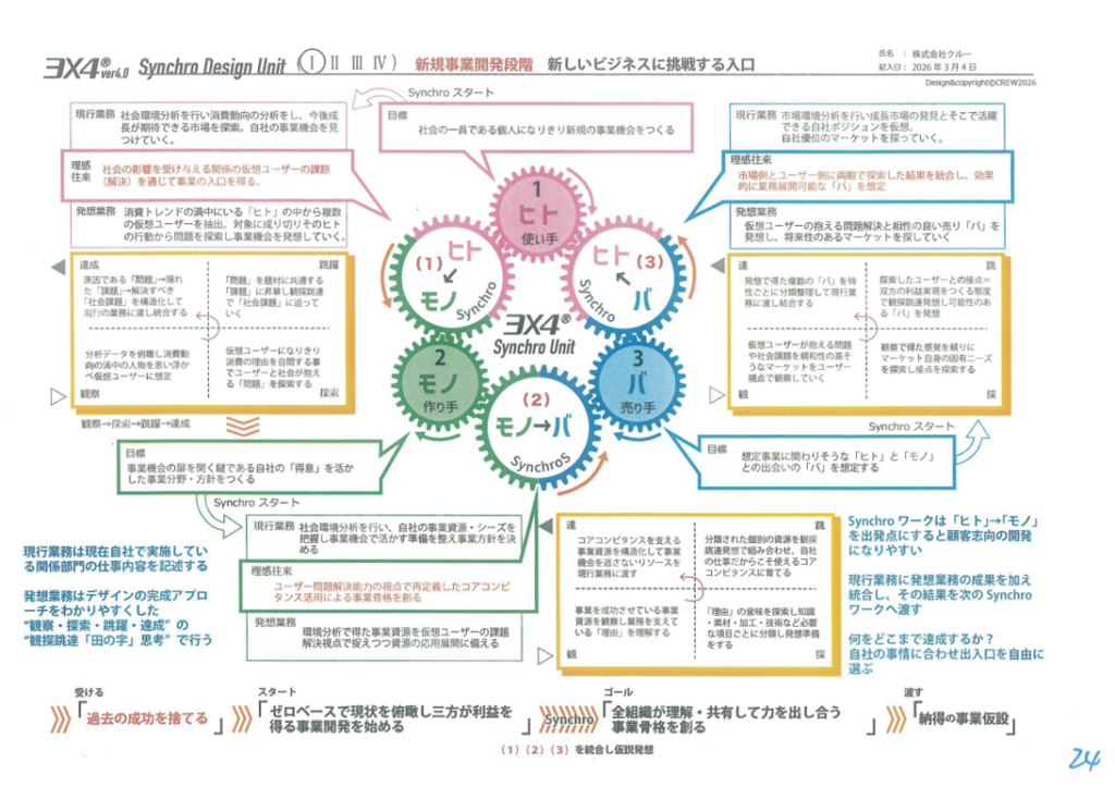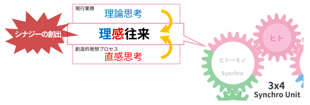 「理感往来」の哲学を組み込んだ「3×4 Business Synchro Design」は、理論的に進める「現行業務」の枠組みを大きく変えることなく、直感を活かした「創造的な発想プロセス」を無理なく組み込めるように設計されています。