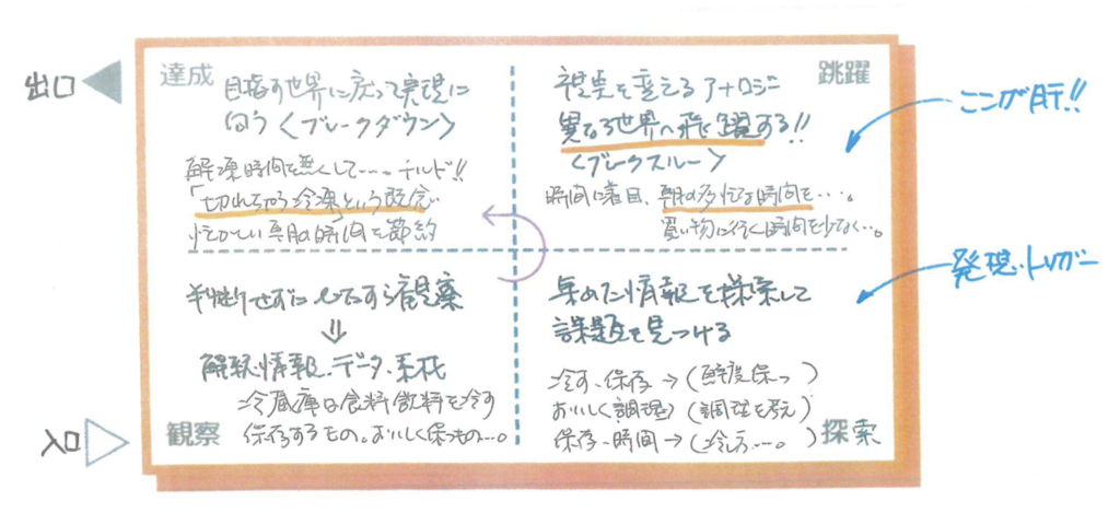 「観察(事実を捉える)」「探索(深掘りする)」「跳躍(直感で飛躍する)」そして「達成(現実の形にする)」。